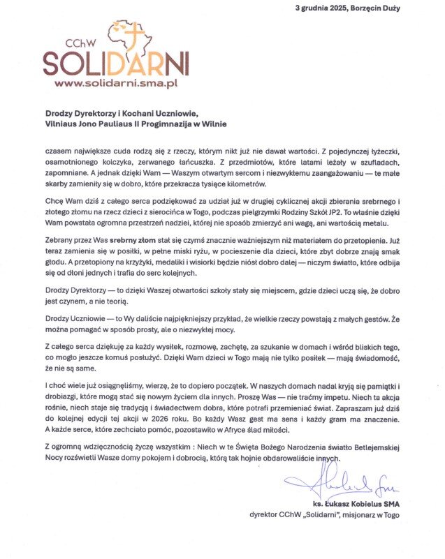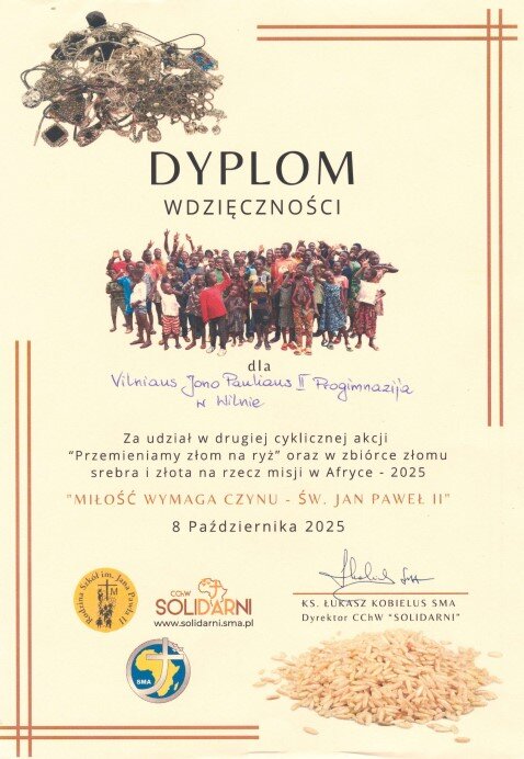 Mūsų mokykla – Vilniaus Jono Pauliaus II progimnazija – dalyvavo antrojoje ciklinėje solidarumo akcijoje „Paverčiame metalą ryžiais“, kurios metu rinktas sidabro ir aukso laužas vaikams Afrikoje. Surinktos lėšos virto ryžiais ir realia pagalba Togo vaikams. Už prasmingą iniciatyvą ir bendruomenės įsitraukimą mokykla buvo apdovanota padėkos diplomu. Dėkojame visiems mokiniams, tėvams ir mokytojams už gerumą ir bendrystę.