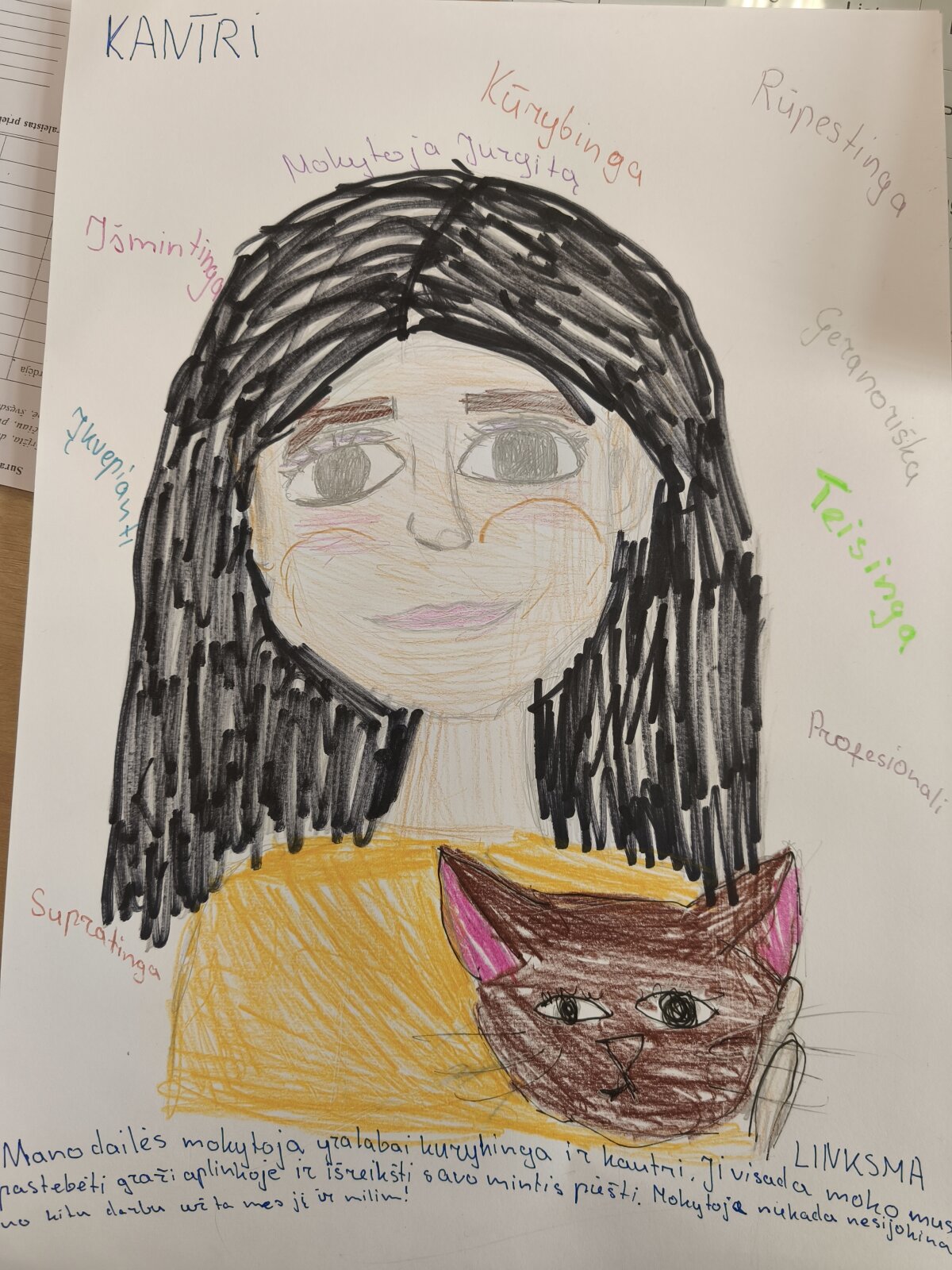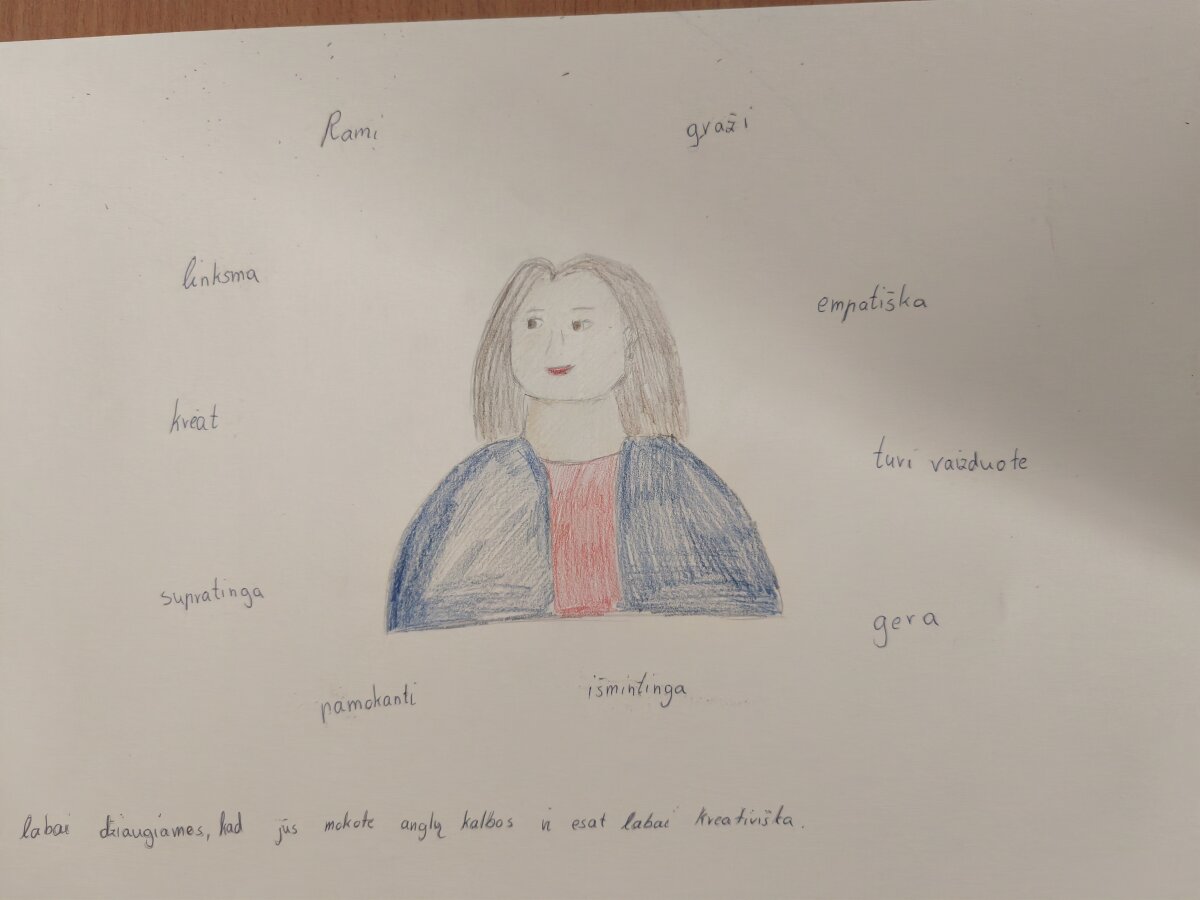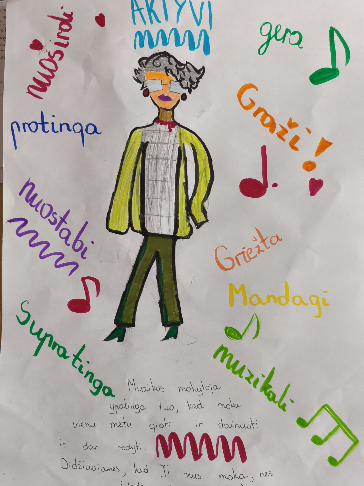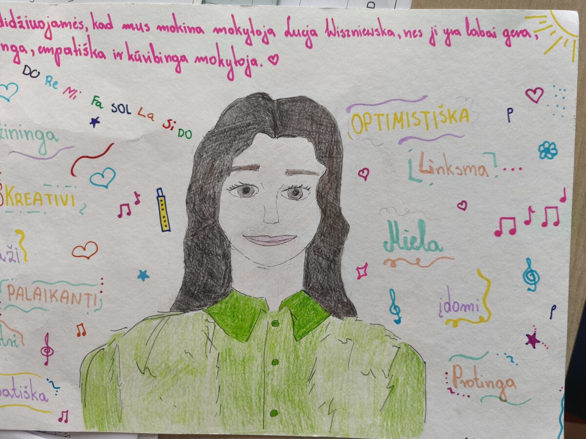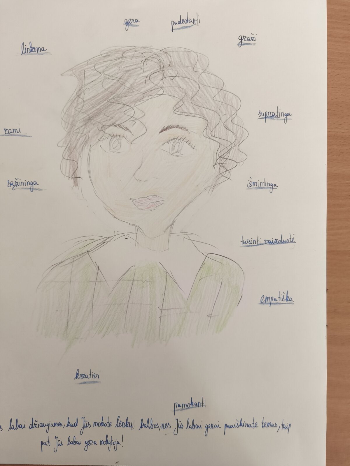 Mokytojų dienos proga 6c, 6e, 8c, 8e ir 8d klasėse lietuvių kalbos pamokos buvo kitokios nei įprastai – be vadovėlių ir be testų! Dirbdami poromis mokiniai turėjo nupiešti pasirinkto dalyko pedagogą. Šalia kiekvieno kūrinio vaikai užrašė būdvardžius bei dalyvius, apibūdinančius jų mokytoją. Ant lapų žydėjo žodžiai: kantri, kūrybinga, šmaikšti, įkvepianti, teisinga, linksma, supratinga, išradinga... Galiausiai kiekvienas parašė trumpą pastraipą, kodėl didžiuojasi, kad būtent šis mokytojas ar mokytoja juos moko. Skaitant šiuos žodžius buvo sunku nesusigraudinti – vaikai rašė, kad mokytojas arba mokytoja moka išmokyti net tada, kai atrodo, jog nieko neįmanoma suprasti, ir jog visada tiki savo mokiniais, net kai jie patys savimi abejoja.