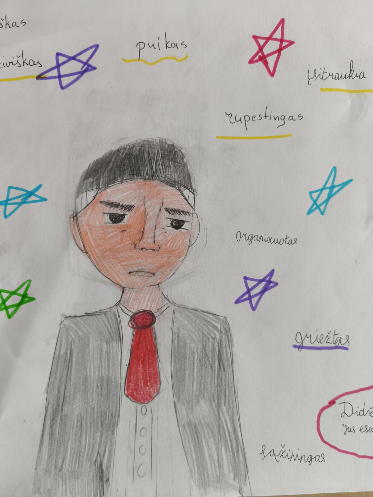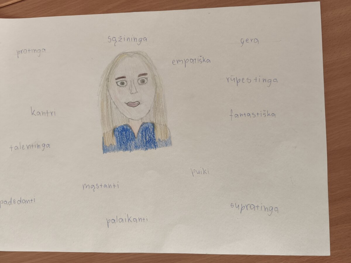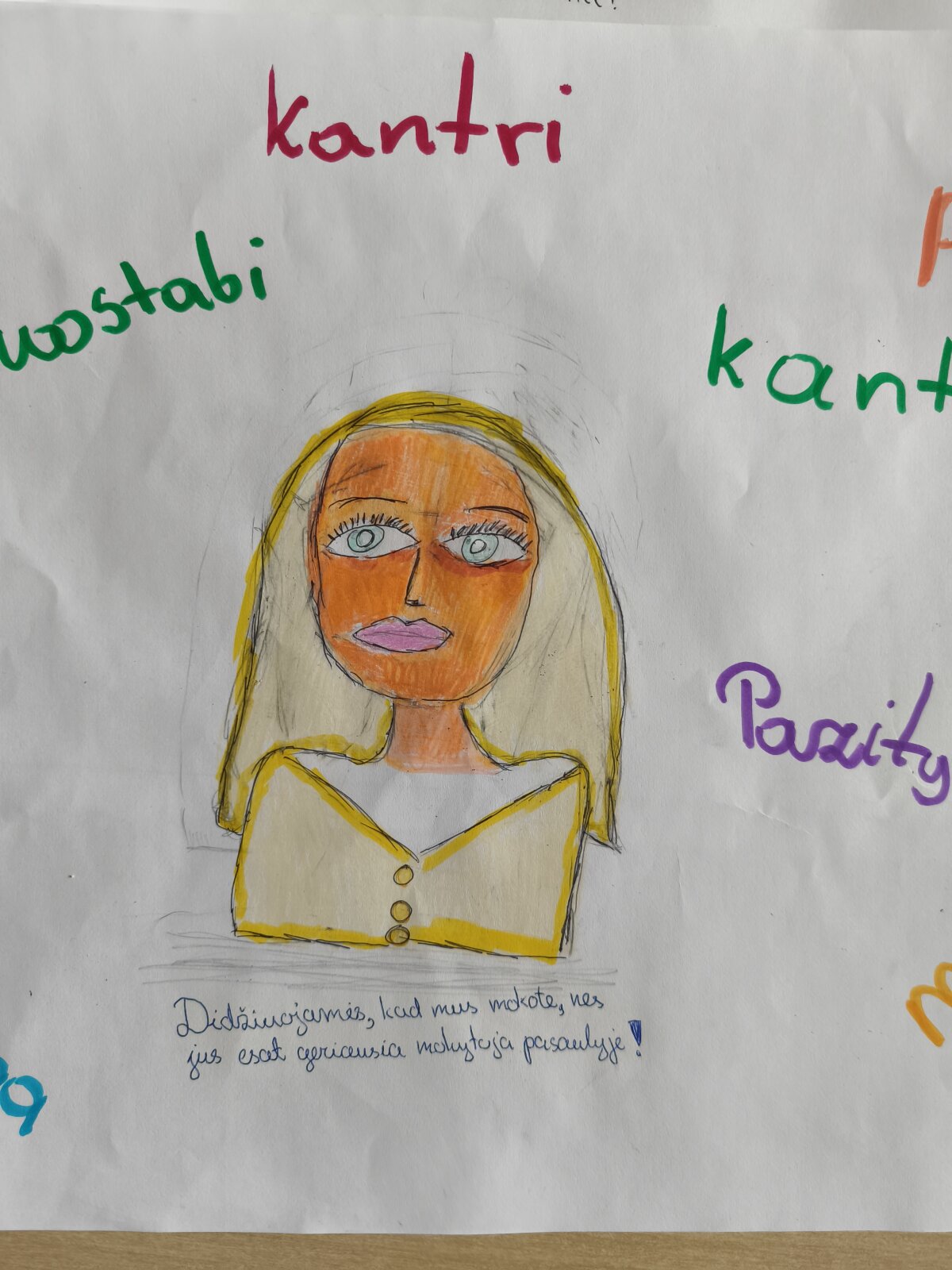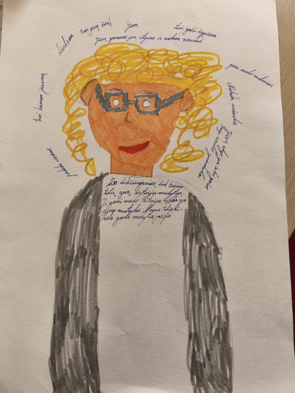 Mokytojų dienos proga 6c, 6e, 8c, 8e ir 8d klasėse lietuvių kalbos pamokos buvo kitokios nei įprastai – be vadovėlių ir be testų! Dirbdami poromis mokiniai turėjo nupiešti pasirinkto dalyko pedagogą. Šalia kiekvieno kūrinio vaikai užrašė būdvardžius bei dalyvius, apibūdinančius jų mokytoją. Ant lapų žydėjo žodžiai: kantri, kūrybinga, šmaikšti, įkvepianti, teisinga, linksma, supratinga, išradinga... Galiausiai kiekvienas parašė trumpą pastraipą, kodėl didžiuojasi, kad būtent šis mokytojas ar mokytoja juos moko. Skaitant šiuos žodžius buvo sunku nesusigraudinti – vaikai rašė, kad mokytojas arba mokytoja moka išmokyti net tada, kai atrodo, jog nieko neįmanoma suprasti, ir jog visada tiki savo mokiniais, net kai jie patys savimi abejoja.