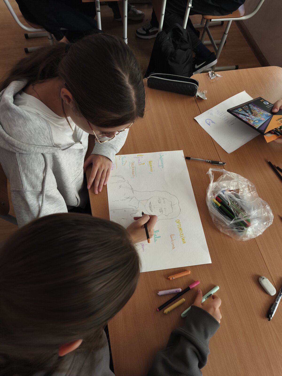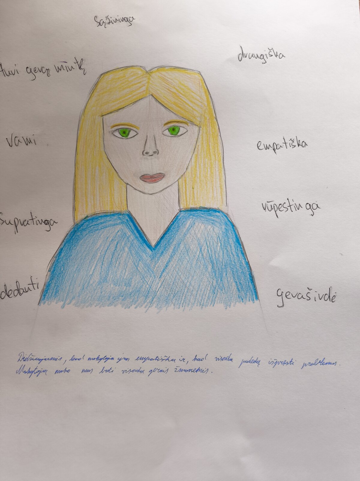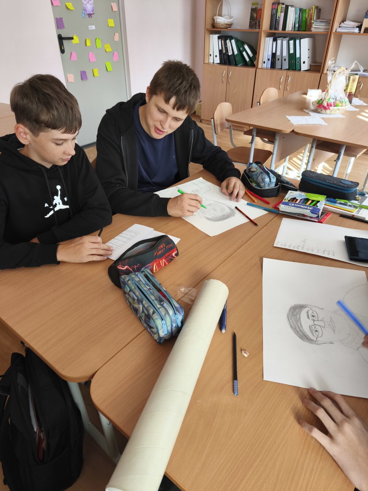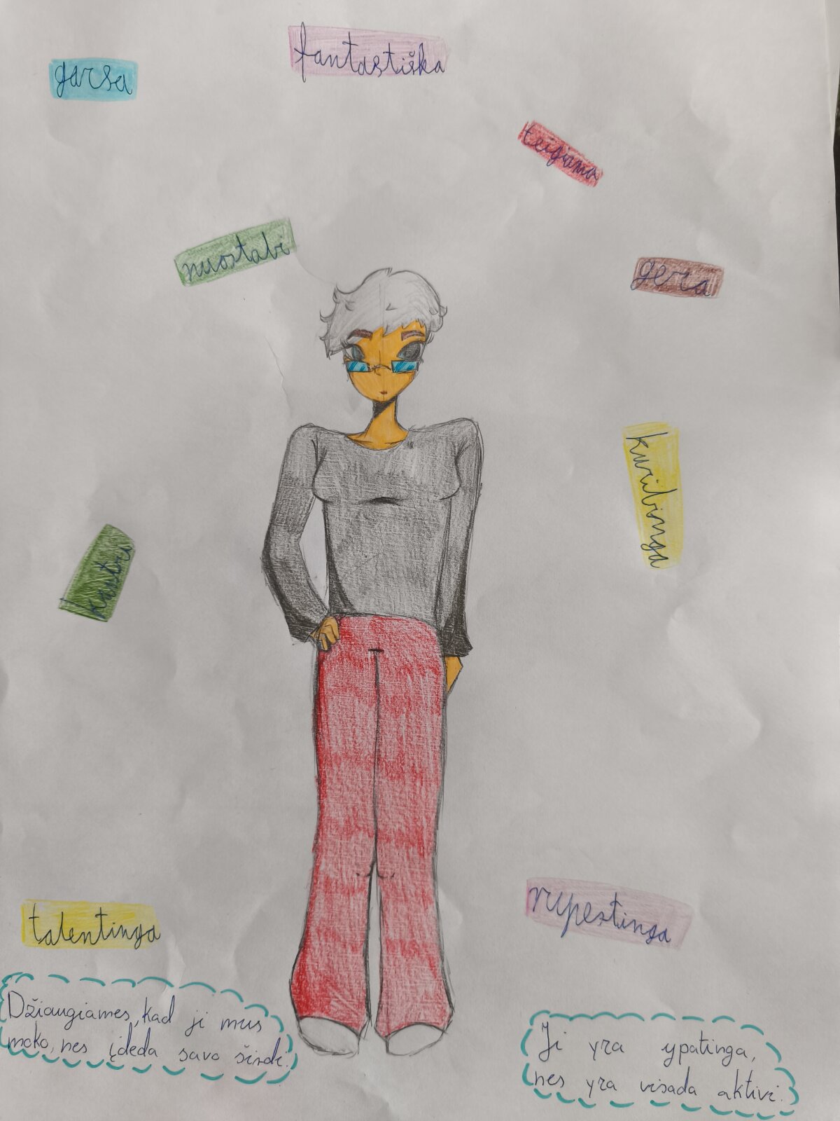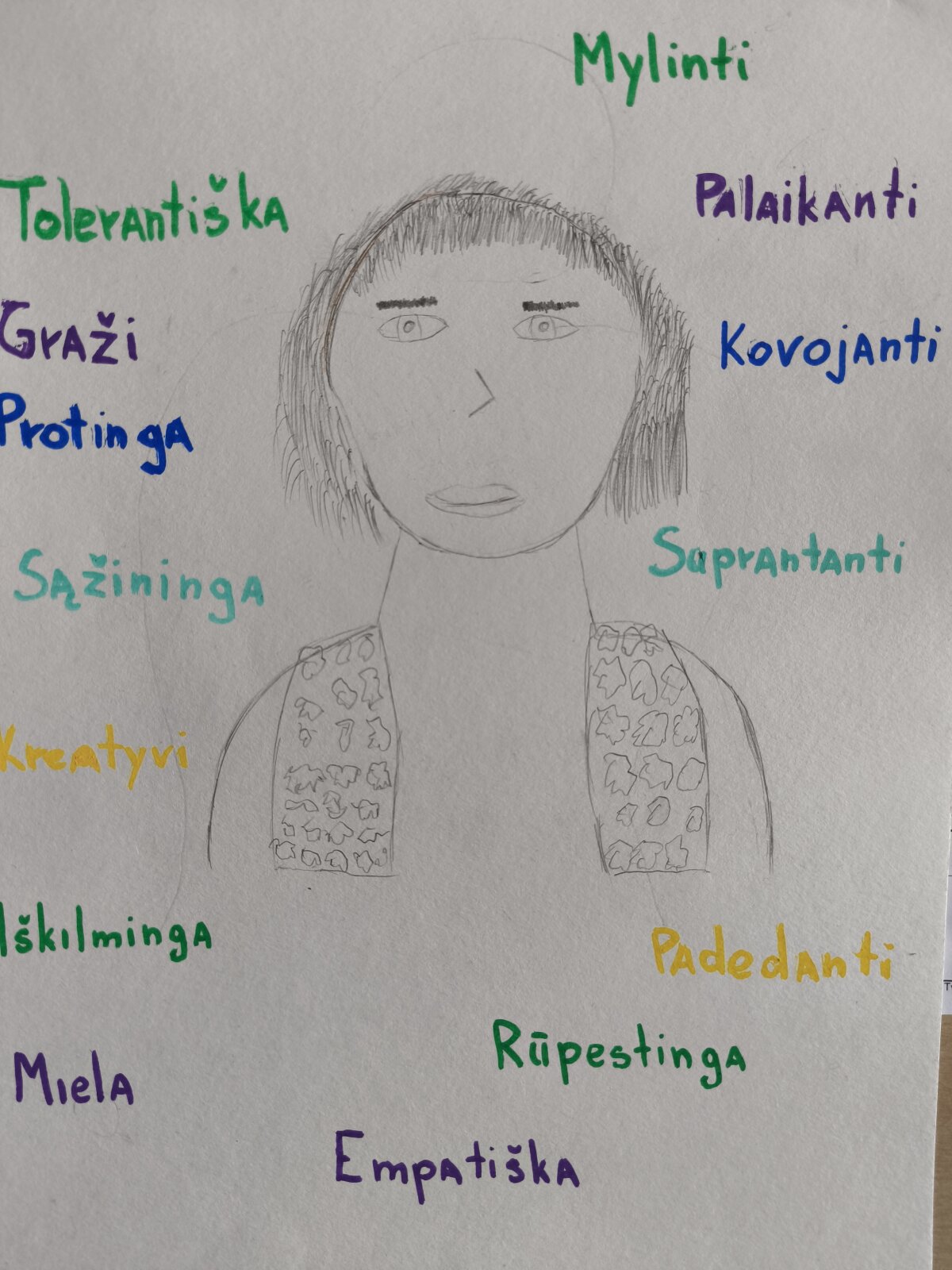Mokytojų dienos proga 6c, 6e, 8c, 8e ir 8d klasėse lietuvių kalbos pamokos buvo kitokios nei įprastai – be vadovėlių ir be testų! Dirbdami poromis mokiniai turėjo nupiešti pasirinkto dalyko pedagogą. Šalia kiekvieno kūrinio vaikai užrašė būdvardžius bei dalyvius, apibūdinančius jų mokytoją. Ant lapų žydėjo žodžiai: kantri, kūrybinga, šmaikšti, įkvepianti, teisinga, linksma, supratinga, išradinga... Galiausiai kiekvienas parašė trumpą pastraipą, kodėl didžiuojasi, kad būtent šis mokytojas ar mokytoja juos moko. Skaitant šiuos žodžius buvo sunku nesusigraudinti – vaikai rašė, kad mokytojas arba mokytoja moka išmokyti net tada, kai atrodo, jog nieko neįmanoma suprasti, ir jog visada tiki savo mokiniais, net kai jie patys savimi abejoja.