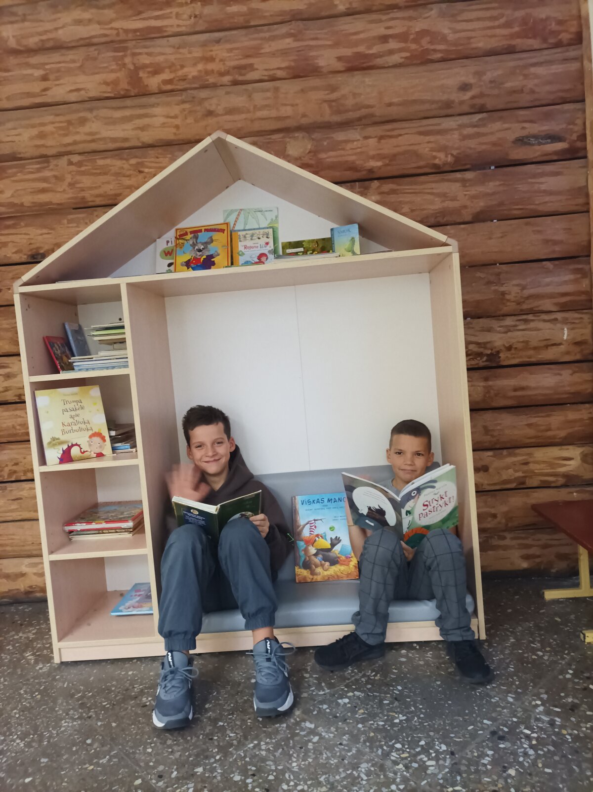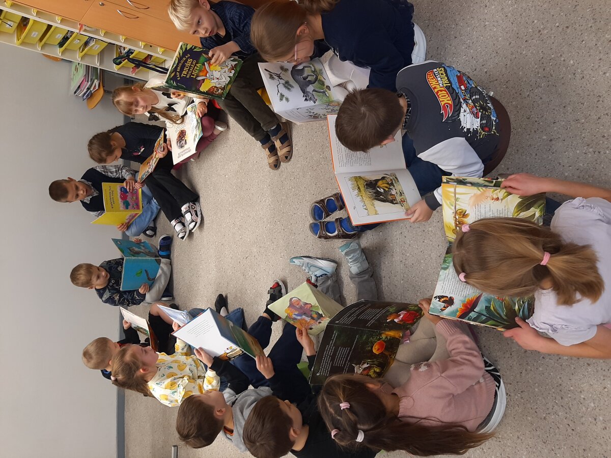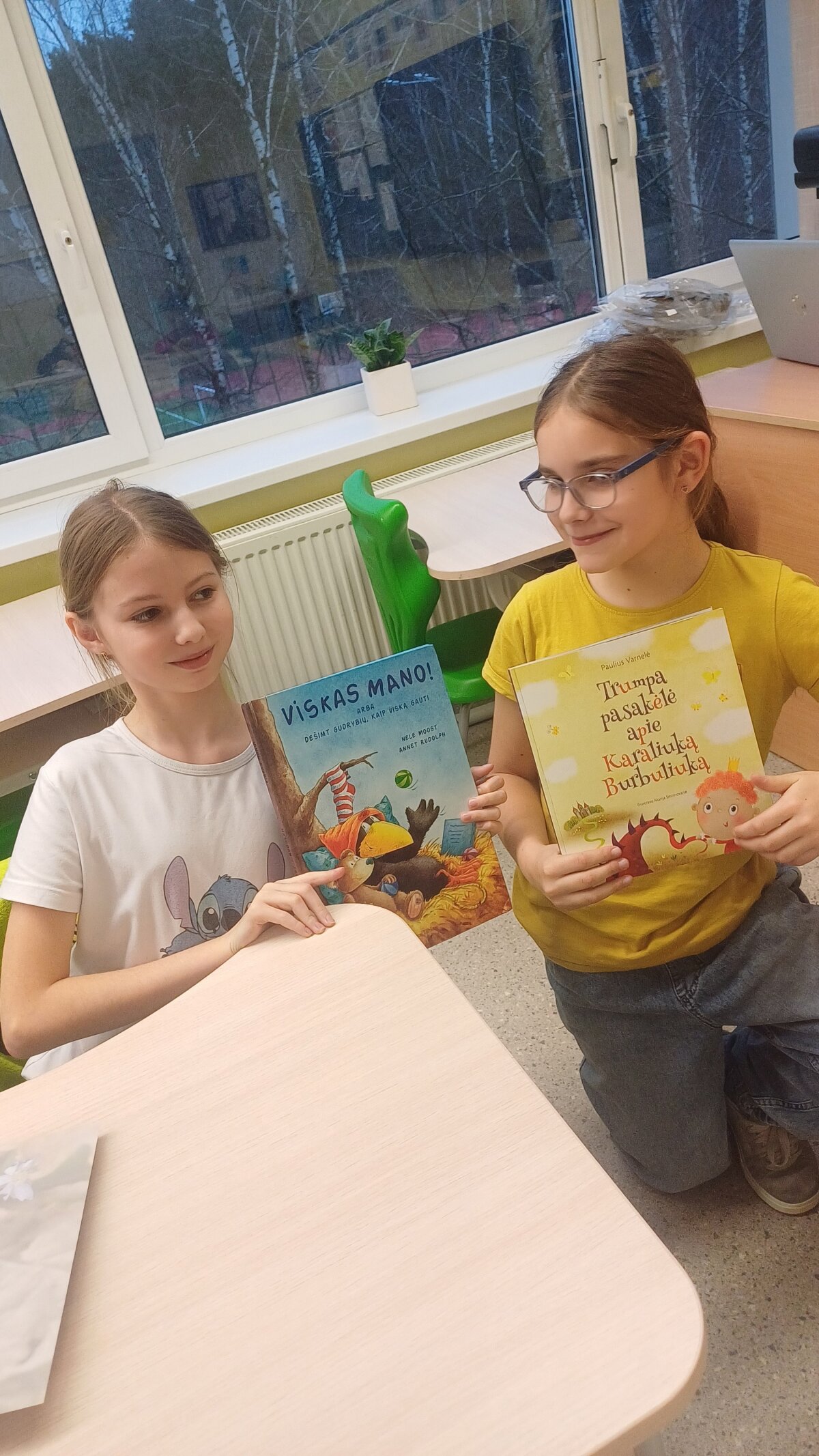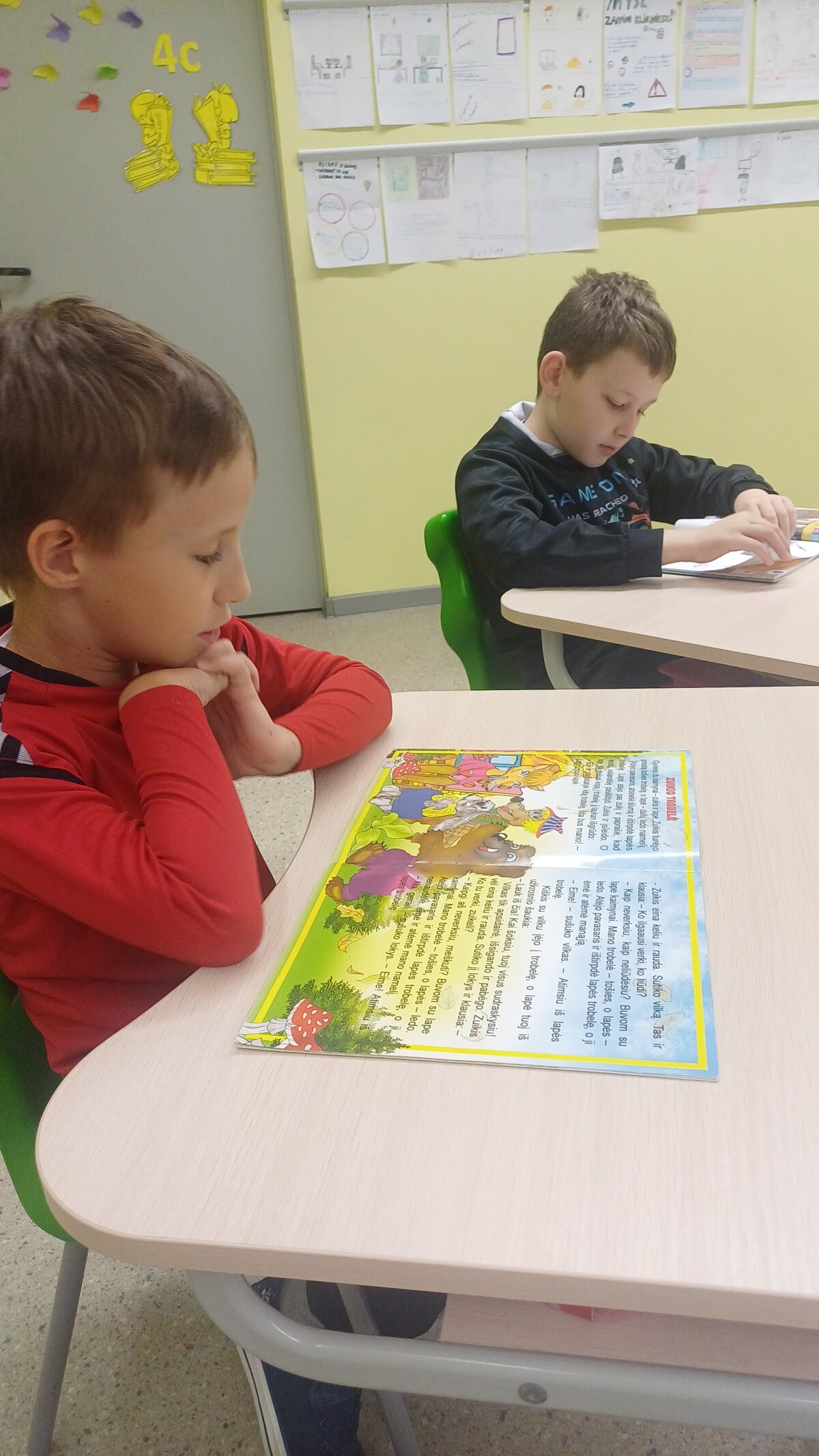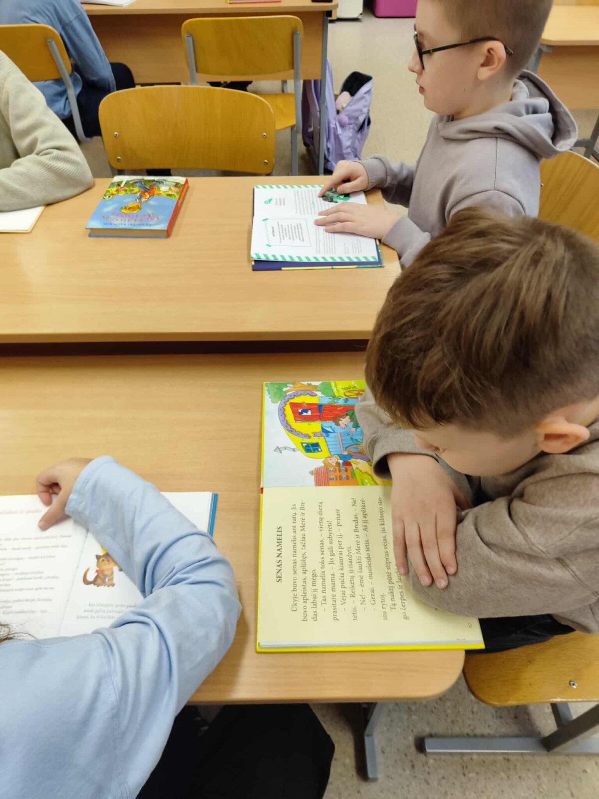 Truputį pailsėję, mokiniai sėdasi į suolus ir atsiduria knygų pasaulyje. Šis laikas skirtas reguliariam ir įdėmiam lietuviškų knygelių skaitymui, kuris yra esminis siekiant tobulinti kalbos įgūdžius. Kas tyliai, kas pusbalsiu, vaikai panyra į pasakojimus, keliaudami po vaizduotės šalis. Perskaitę istorijas ar jų ištraukas, išsinagrinėję paveikslėlius, mokiniai aktyviai dalinasi patirtais įspūdžiais ir mintimis su draugais. Tokios diskusijos ne tik padeda geriau įsisavinti naują žodyną, bet ir skatina laisvai ir taisyklingai reikšti mintis lietuvių kalba. Knygų pasirinkimas didelis: kiekviename kabinete įrengta maža „bibliotekėlė“, o jeigu nerandama tinkamos knygos, mokiniai skuba į mokyklos biblioteką arba apžiūri koridoriuose pastatytas „namelių“ lentynėles, kuriose nuolat papildoma literatūra. Ši veikla praturtinama gražia bendruomeniškumo tradicija: reguliariai pas pirmokus ateina vyresnių klasių mokiniai (paprastai 5–8 klasių). Jie tampa mažaisiais mentoriais ir skaito mažiesiems pasakas bei įdomias istorijas lietuvių kalba. Šios popietės suteikia pirmokams progą išgirsti pavyzdinį lietuvišką tarimą ir intonaciją, o vyresniesiems – ugdyti atsakomybę ir viešojo kalbėjimo įgūdžius. Skaitydami knygas ir dalindamiesi jomis, vaikai lavinasi, ugdo savyje gėrį ir stato tvirtus lietuvių kalbos ir literatūros pamatus ateičiai. Taigi, anot rašytojo H. Ibseno, „Tu knygą pamėgsi, tave pamėgs visas pasaulis“.