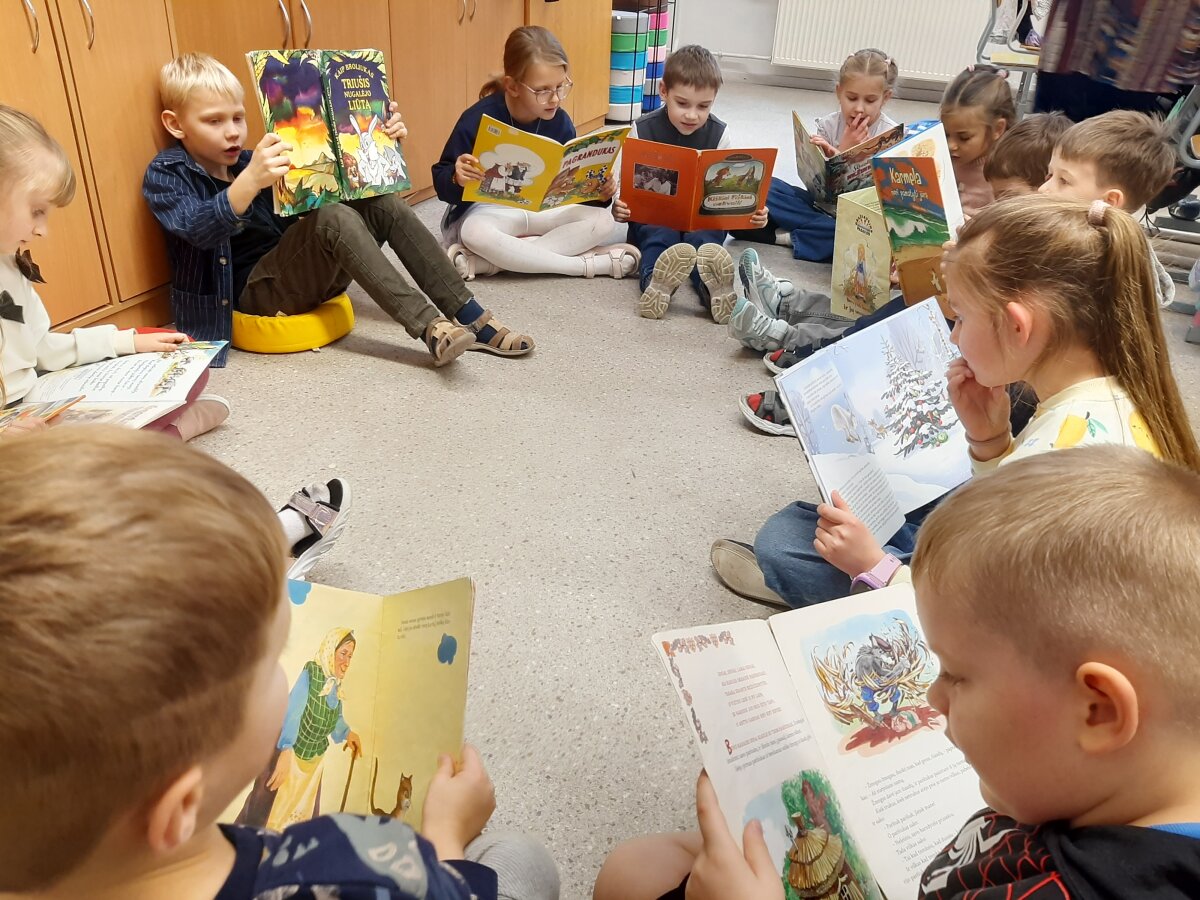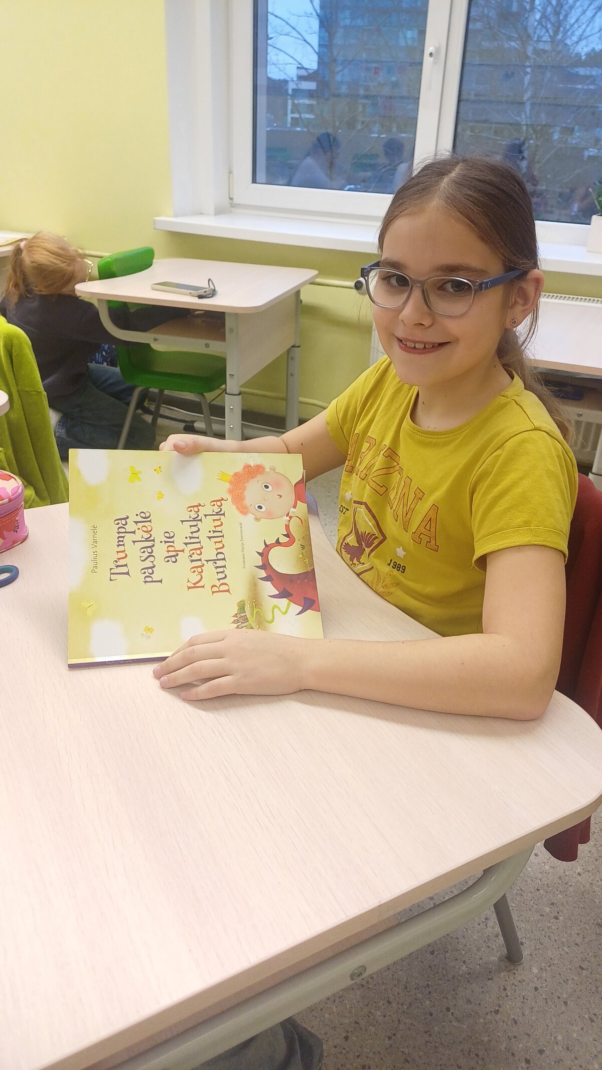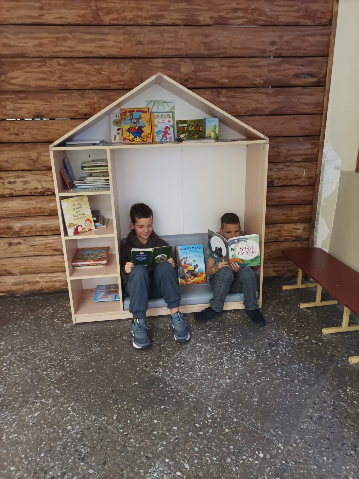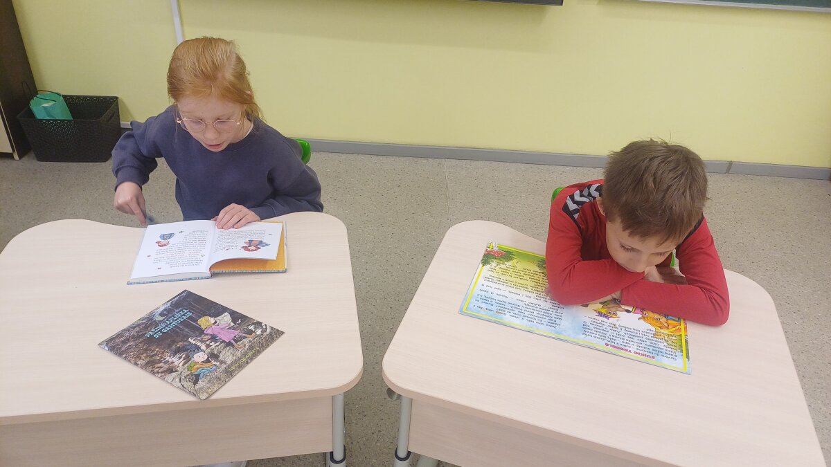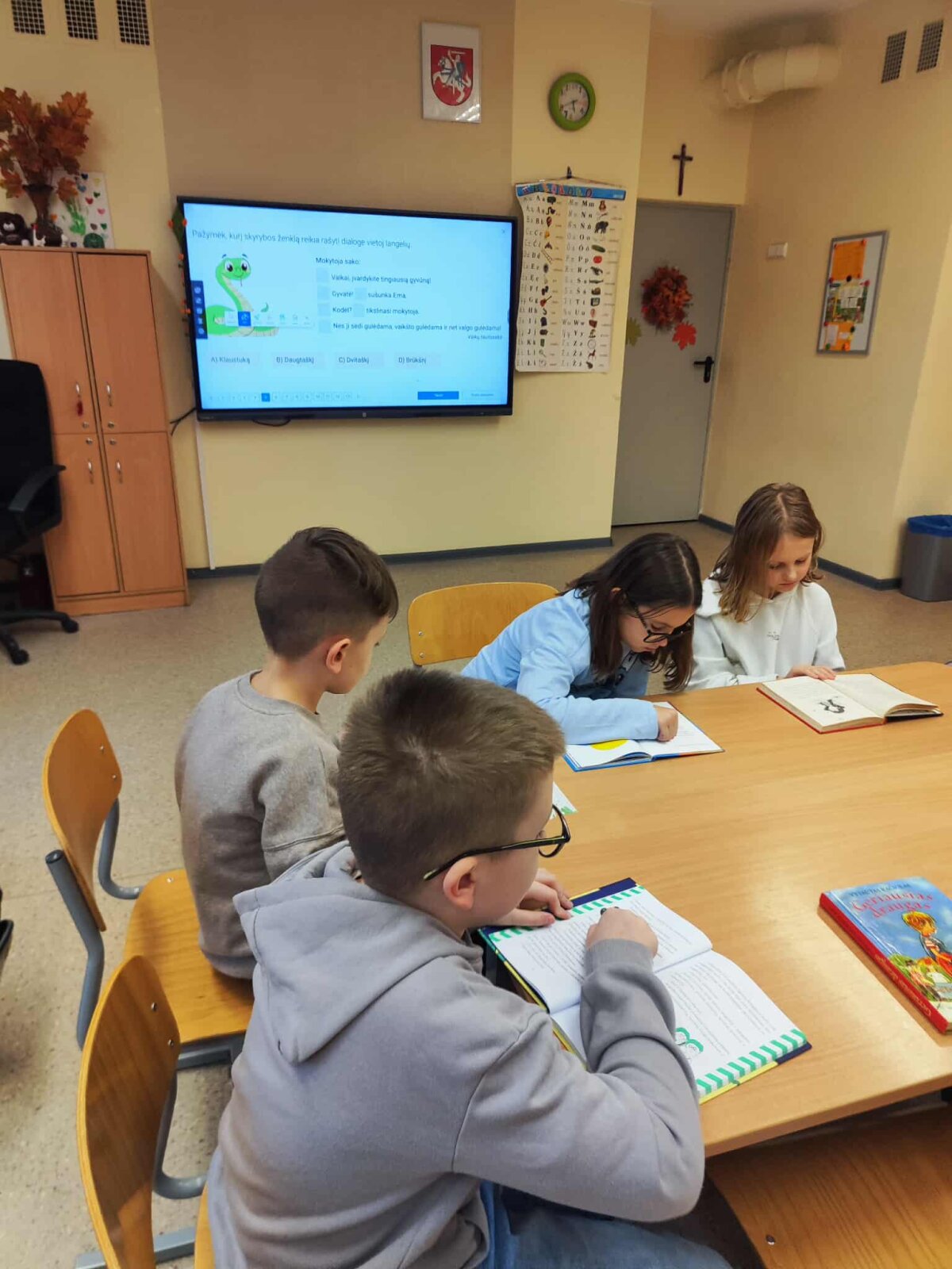 Truputį pailsėję, mokiniai sėdasi į suolus ir atsiduria knygų pasaulyje. Šis laikas skirtas reguliariam ir įdėmiam lietuviškų knygelių skaitymui, kuris yra esminis siekiant tobulinti kalbos įgūdžius. Kas tyliai, kas pusbalsiu, vaikai panyra į pasakojimus, keliaudami po vaizduotės šalis. Perskaitę istorijas ar jų ištraukas, išsinagrinėję paveikslėlius, mokiniai aktyviai dalinasi patirtais įspūdžiais ir mintimis su draugais. Tokios diskusijos ne tik padeda geriau įsisavinti naują žodyną, bet ir skatina laisvai ir taisyklingai reikšti mintis lietuvių kalba. Knygų pasirinkimas didelis: kiekviename kabinete įrengta maža „bibliotekėlė“, o jeigu nerandama tinkamos knygos, mokiniai skuba į mokyklos biblioteką arba apžiūri koridoriuose pastatytas „namelių“ lentynėles, kuriose nuolat papildoma literatūra. Ši veikla praturtinama gražia bendruomeniškumo tradicija: reguliariai pas pirmokus ateina vyresnių klasių mokiniai (paprastai 5–8 klasių). Jie tampa mažaisiais mentoriais ir skaito mažiesiems pasakas bei įdomias istorijas lietuvių kalba. Šios popietės suteikia pirmokams progą išgirsti pavyzdinį lietuvišką tarimą ir intonaciją, o vyresniesiems – ugdyti atsakomybę ir viešojo kalbėjimo įgūdžius. Skaitydami knygas ir dalindamiesi jomis, vaikai lavinasi, ugdo savyje gėrį ir stato tvirtus lietuvių kalbos ir literatūros pamatus ateičiai. Taigi, anot rašytojo H. Ibseno, „Tu knygą pamėgsi, tave pamėgs visas pasaulis“.