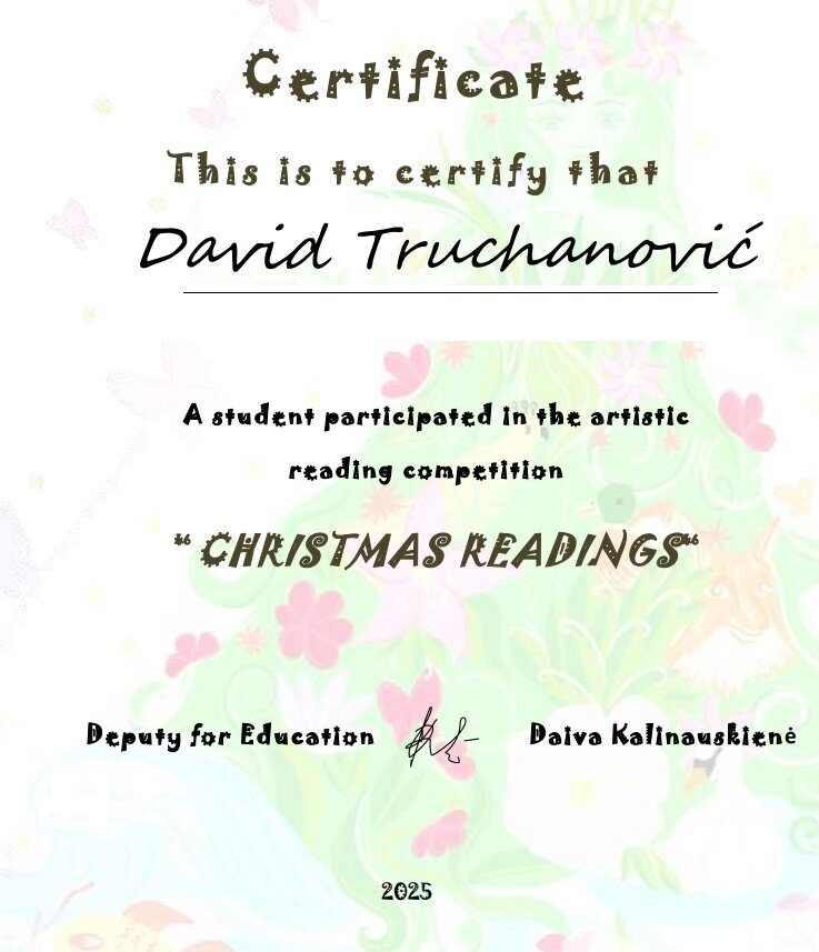 Mūsų mokyklai šiame gražiame renginyje atstovavo 6c klasės mokinys David Truchanovič, kuris savo išraiškingu deklamavimu, taisyklinga anglų kalbos tartimi ir jautriai perteikta kūrinio nuotaika padovanojo klausytojams ypatingų akimirkų.
