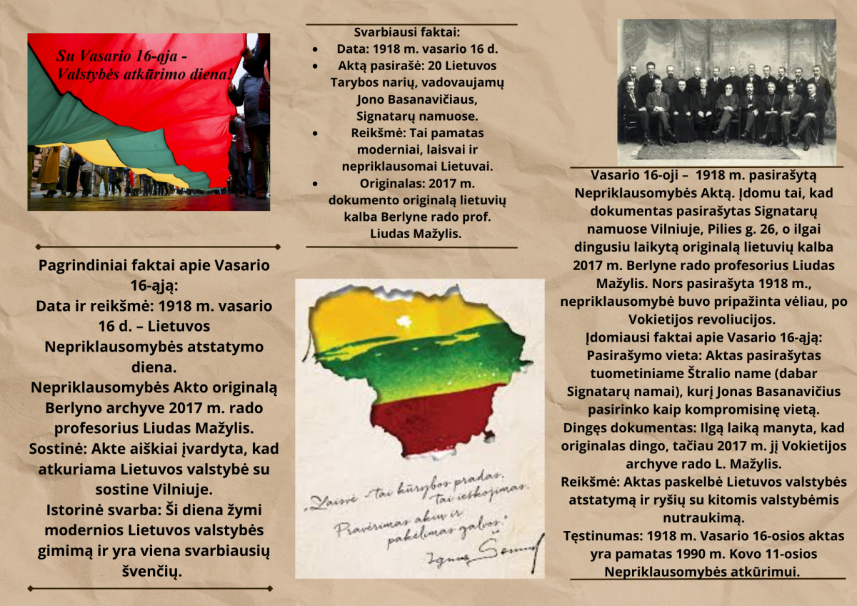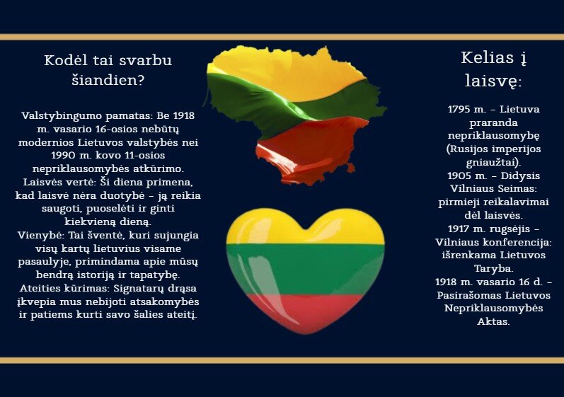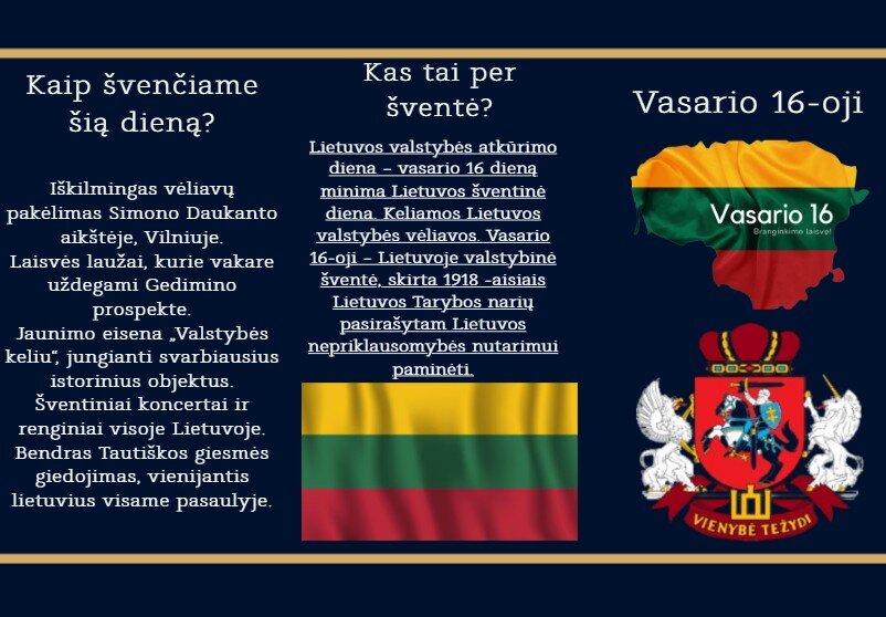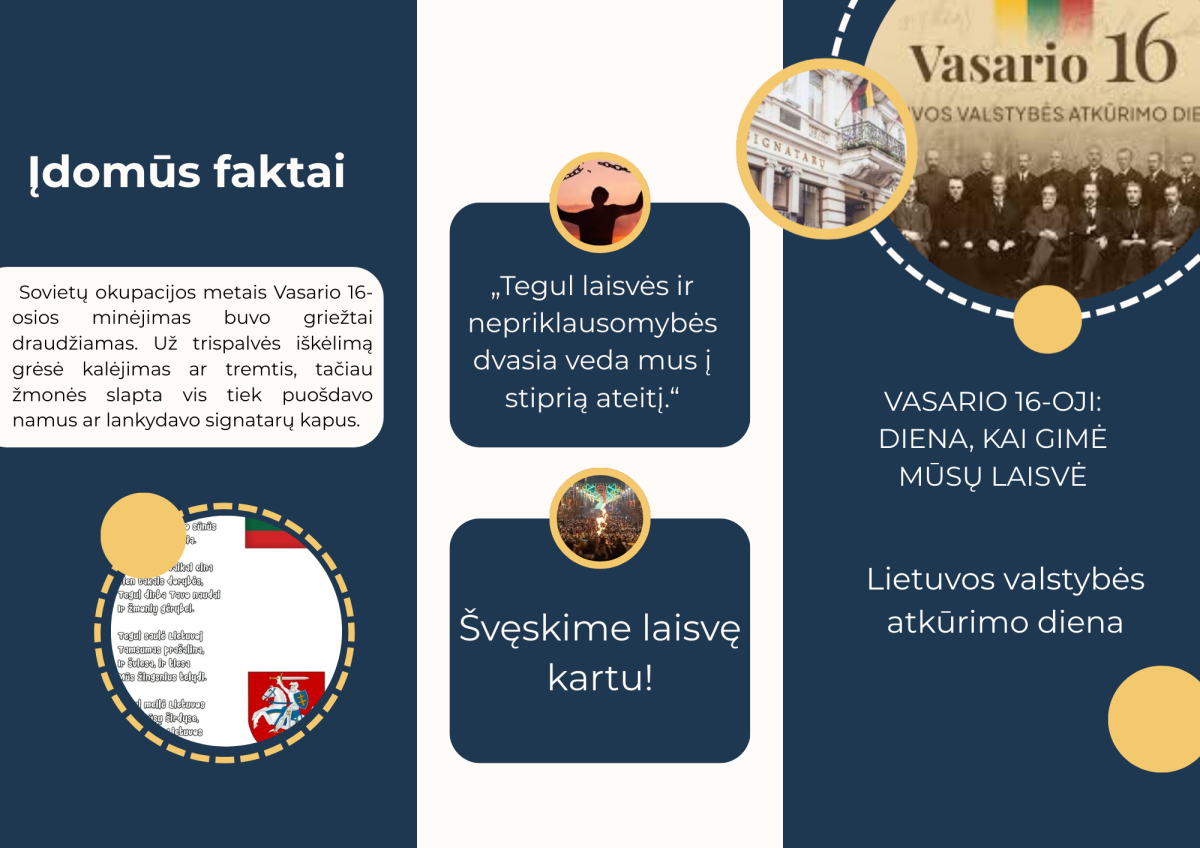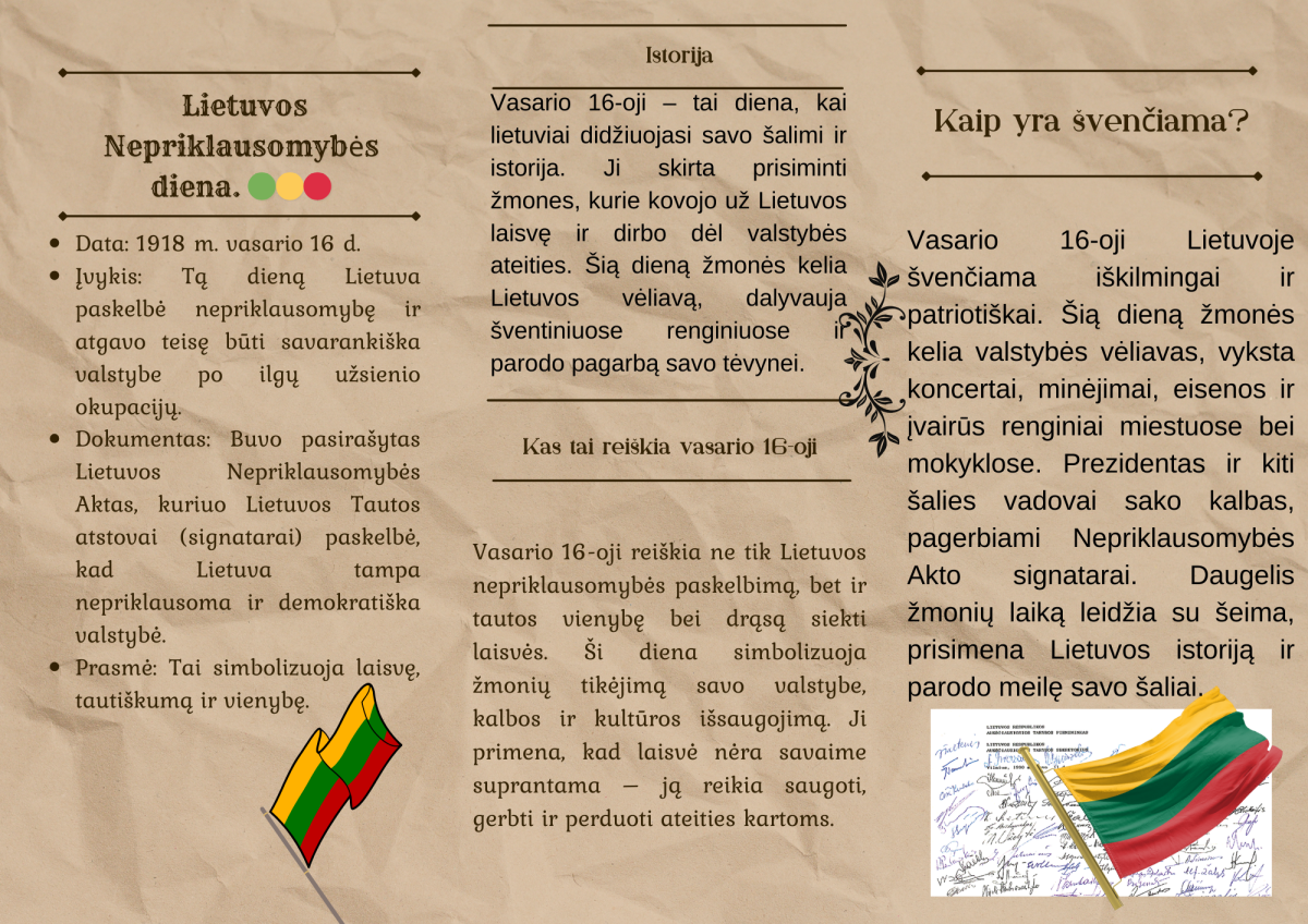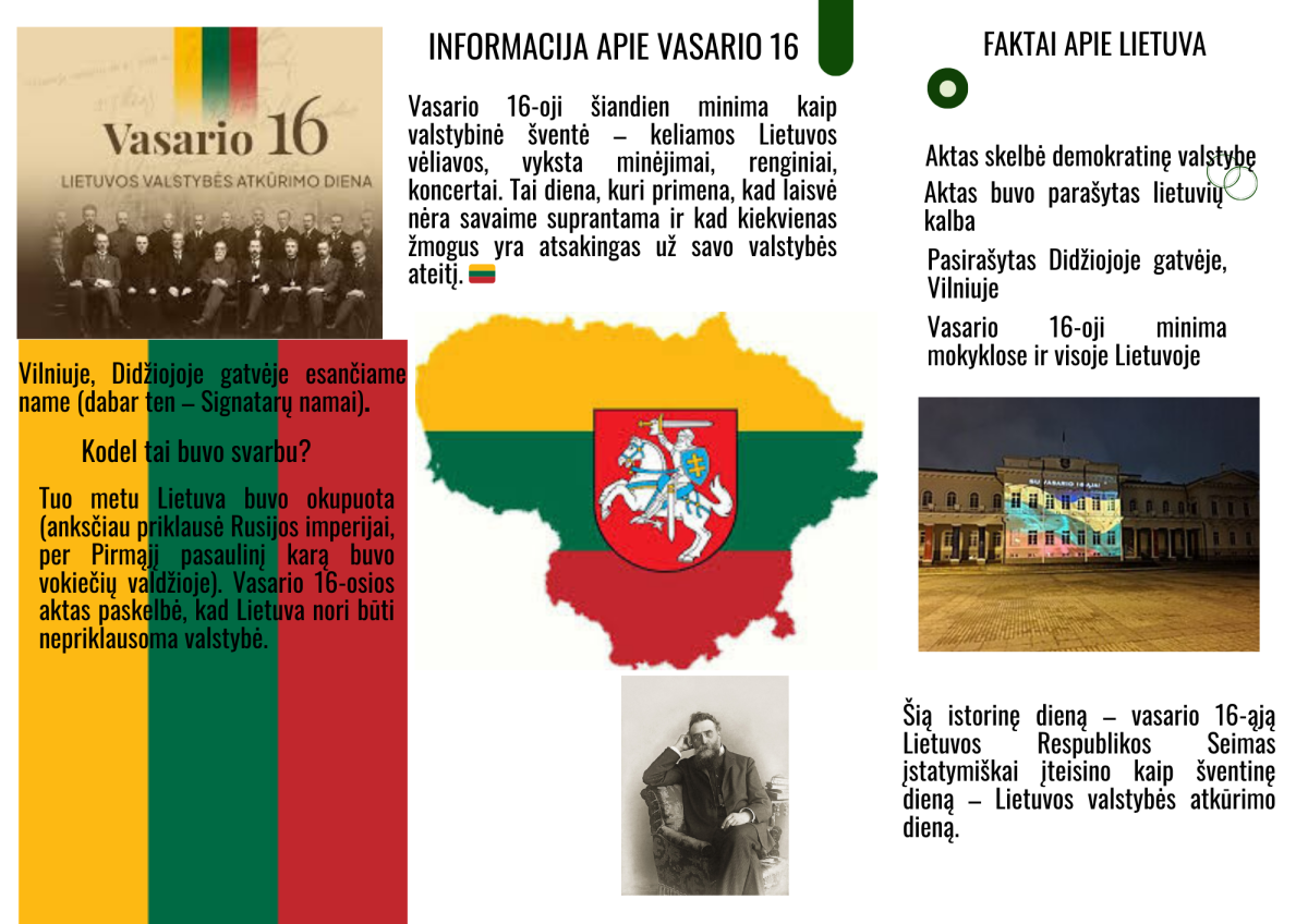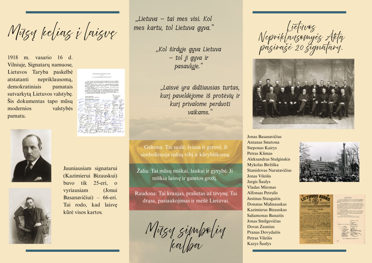 Mokiniai siekė aiškiai ir suprantamai pristatyti, kuo ši diena svarbi šiandieninei Lietuva. Lankstinukuose atsirado svarbiausios datos, trumpi faktai apie valstybės atkūrimą, istoriniai akcentai bei tautiniai simboliai. Naudodamiesi pasirinktais šablonais mokiniai mokėsi tinkamai išdėstyti tekstą ir atsakingai atsirinkti informaciją.