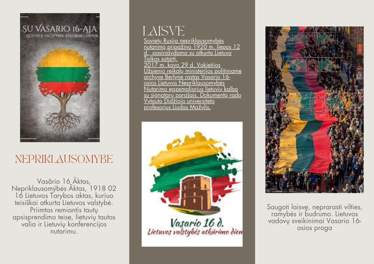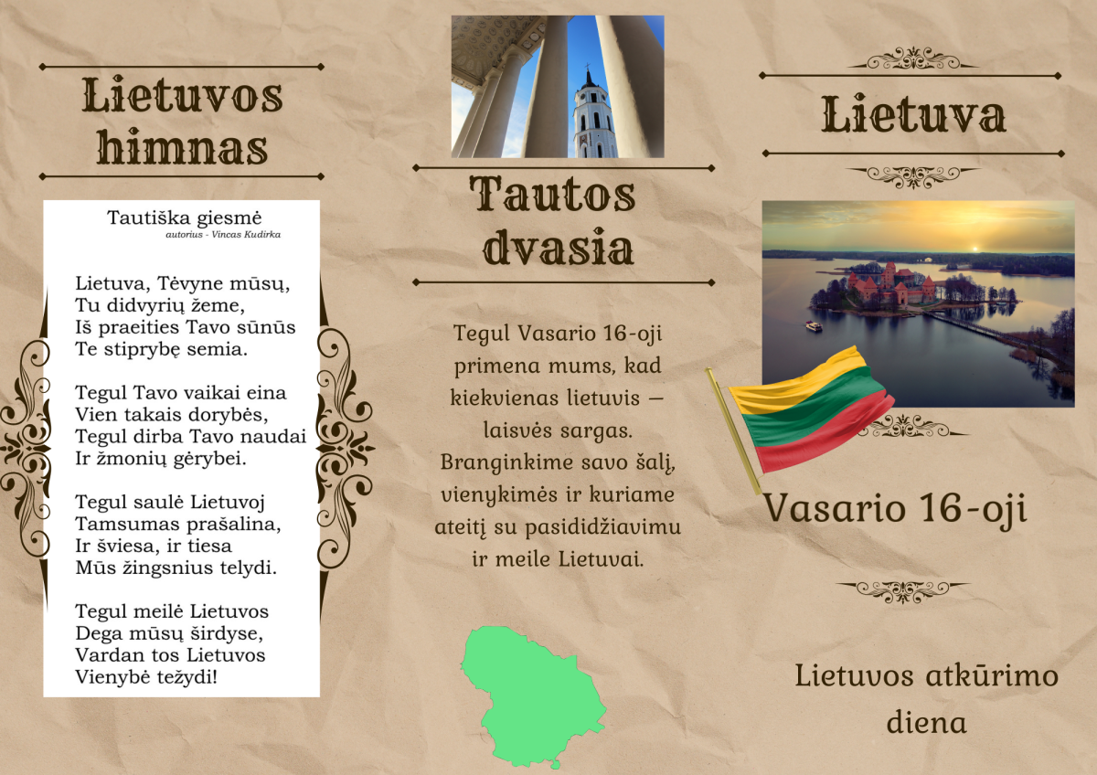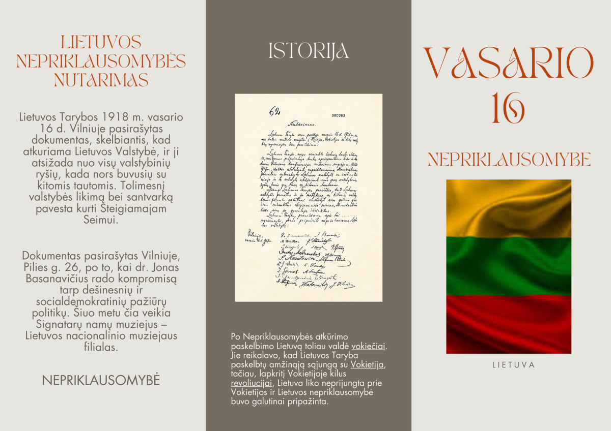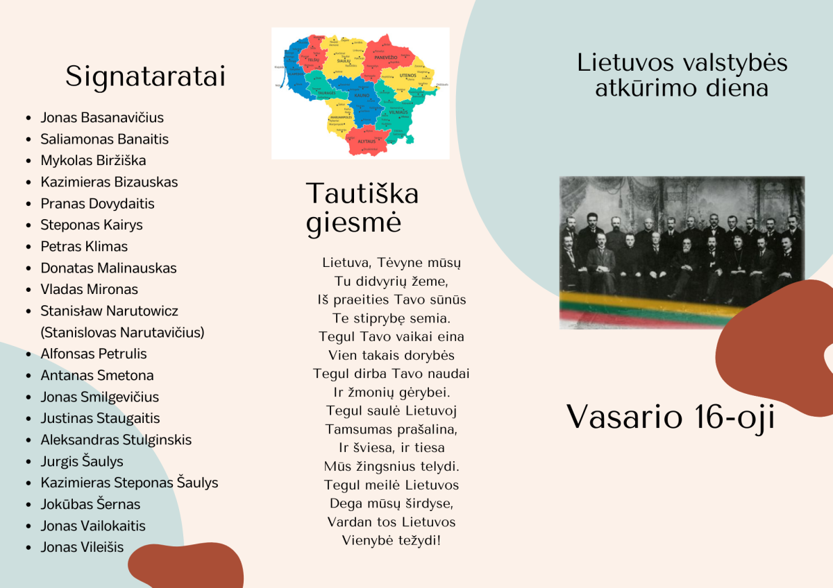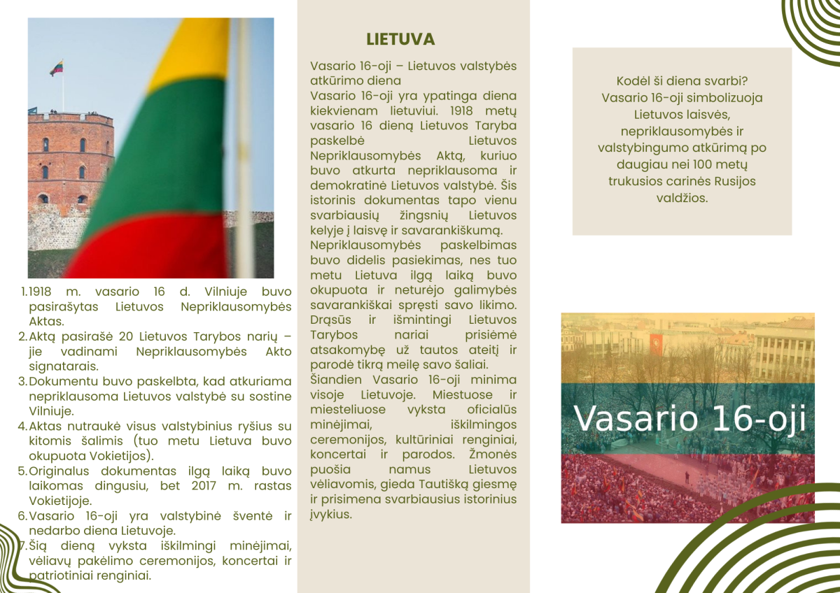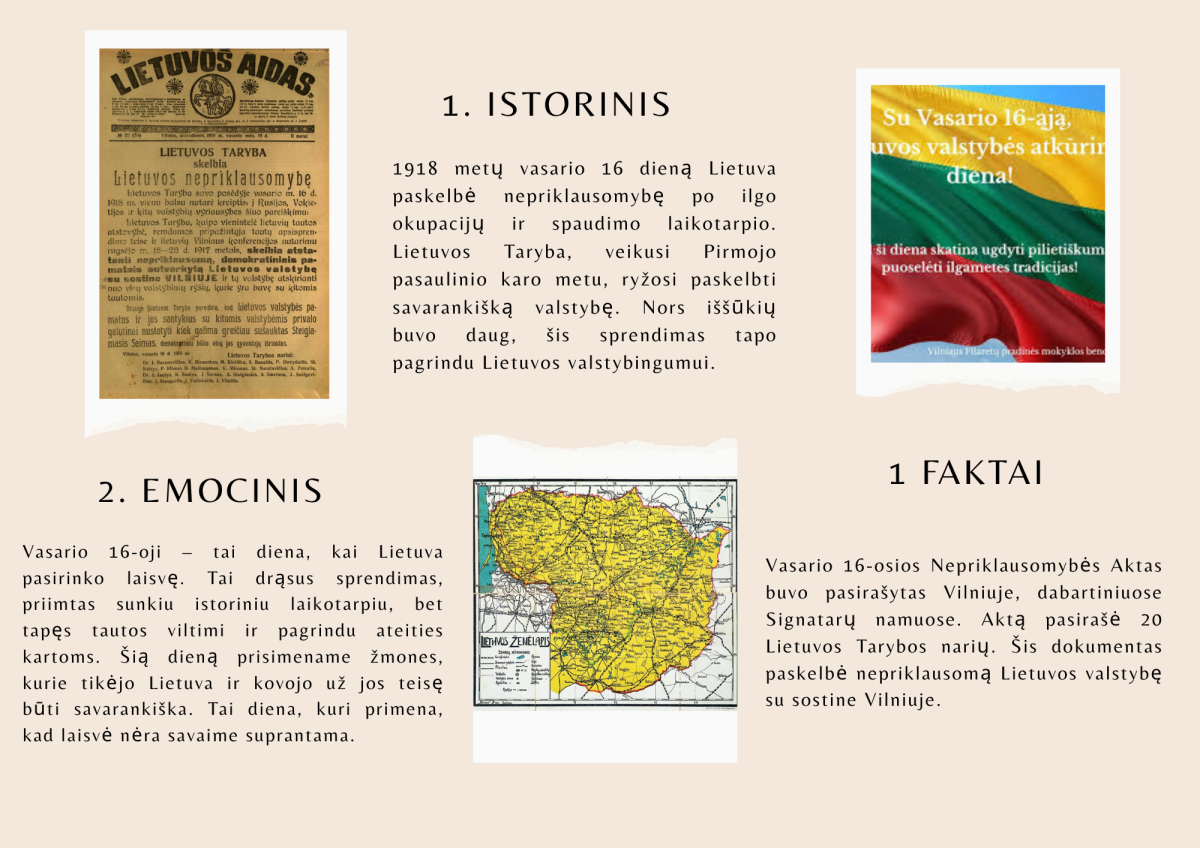 Mokiniai siekė aiškiai ir suprantamai pristatyti, kuo ši diena svarbi šiandieninei Lietuva. Lankstinukuose atsirado svarbiausios datos, trumpi faktai apie valstybės atkūrimą, istoriniai akcentai bei tautiniai simboliai. Naudodamiesi pasirinktais šablonais mokiniai mokėsi tinkamai išdėstyti tekstą ir atsakingai atsirinkti informaciją.