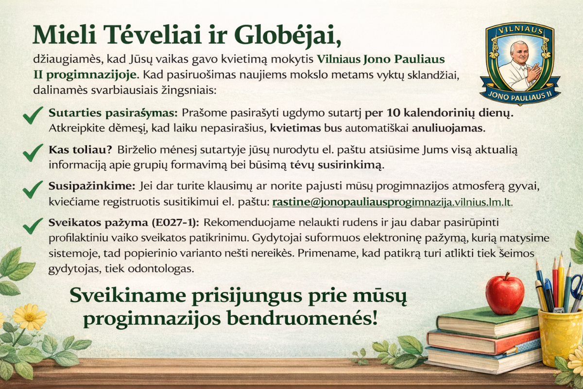 Mieli tėveliai ir globėjai, džiaugiamės, kad Jūsų vaikas gavo kvietimą mokytis Vilniaus Jono Pauliaus II progimnazijoje. Kad pasiruošimas naujiems mokslo metams vyktų sklandžiai, dalinamės svarbiausiais žingsniais: