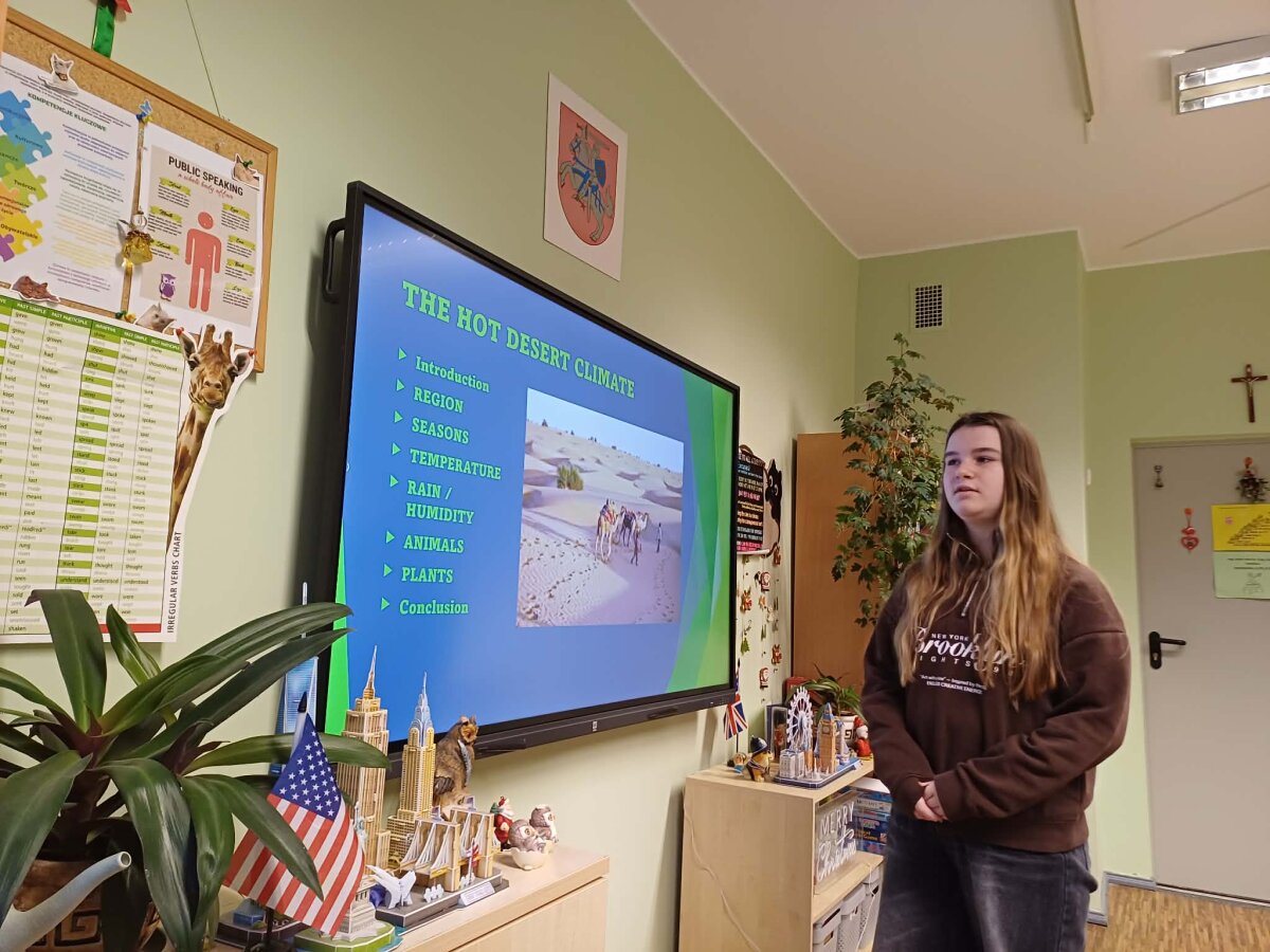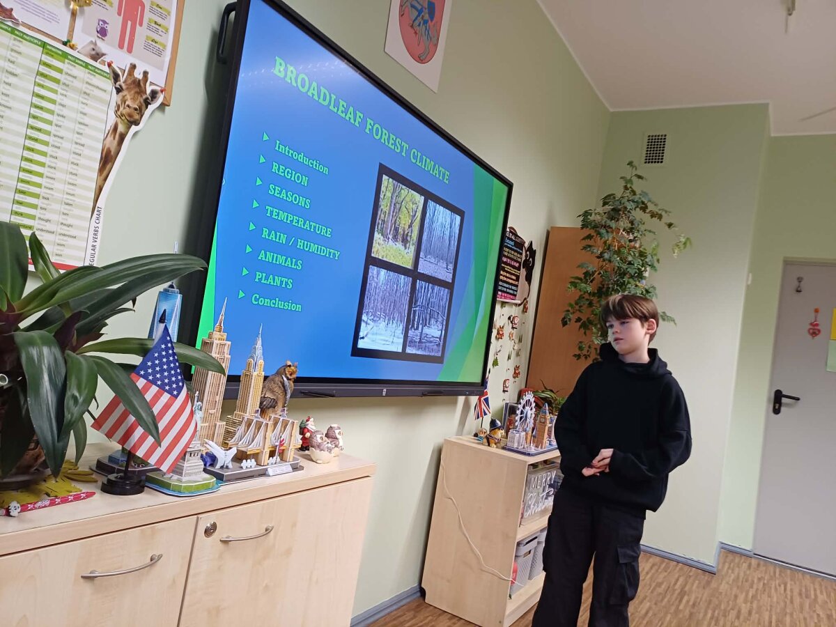 Anglų kalbos pamokose šeštokai kartu su mokytojomis Irena Tačicka ir Karina Balioniene susipažino su skirtumu tarp weather (orai) ir climate (klimatas) bei kartojo anglų kalbos žodyną, susijusį su klimatu. Vėliau jie žiūrėjo edukacinį filmą anglų kalba ir atliko interaktyvias užduotis Wordwall platformoje. Užduotys padėjo užpildyti lentelę apie regionus, aukščiausias ir žemiausias temperatūras, kritulių kiekį, metų laikus bei dažniausiai pasitaikančius augalus ir gyvūnus įvairiose klimato zonose.
