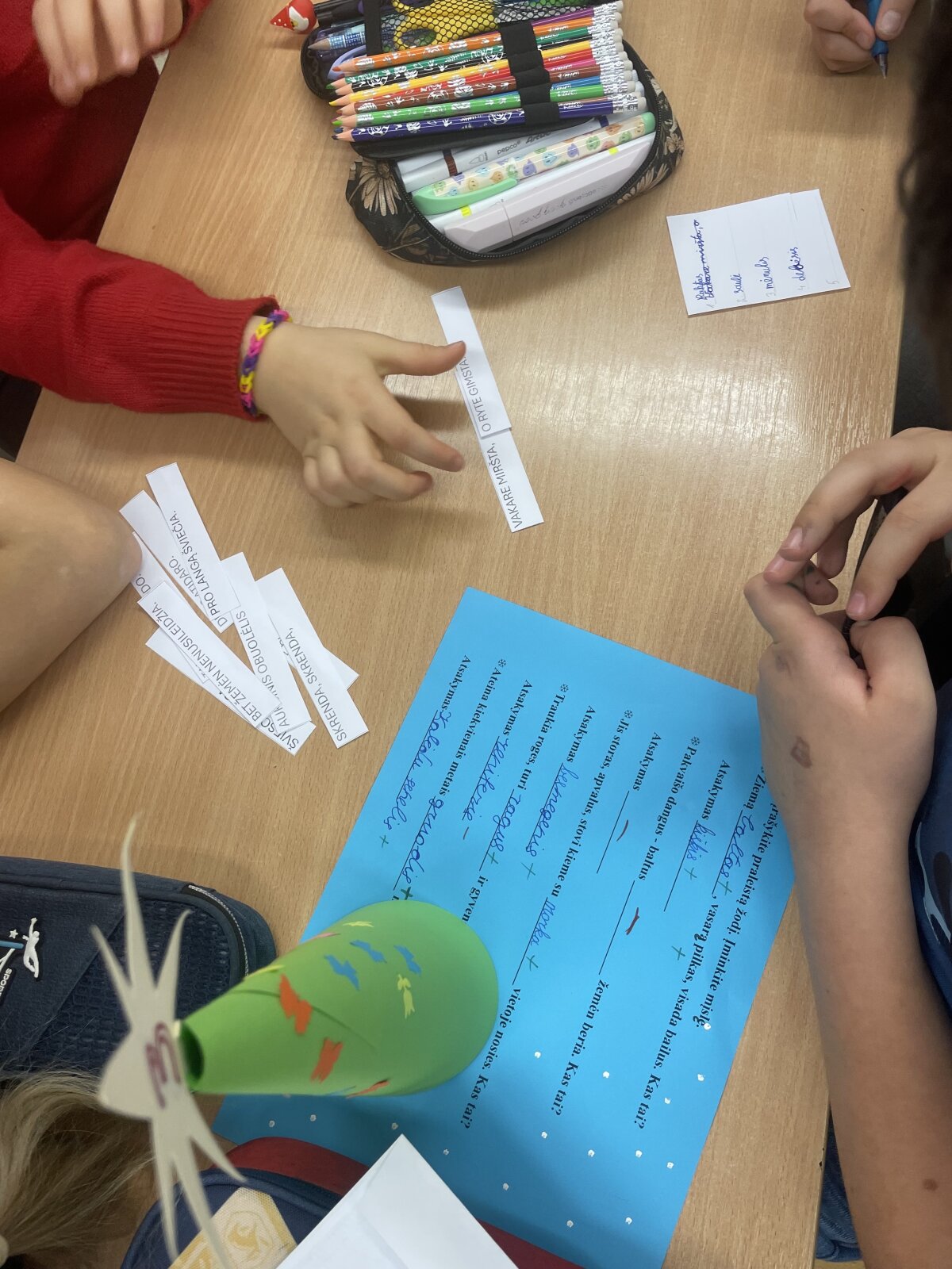 Pamokos metu mokiniai aktyviai įsitraukė į įvairias užduotis: lietuvių ir lenkų kalbomis minė mįsles apie žiemą, atliko interaktyvias užduotis, patys kūrė mįsles, įrašydami trūkstamus žodžius. Trečiokai dirbo grupėmis, todėl klasėje netrūko nei azarto, nei juoko – mokiniai varžėsi dėl taškų, taip pat mokėsi bendradarbiauti ir priimti sprendimus.
