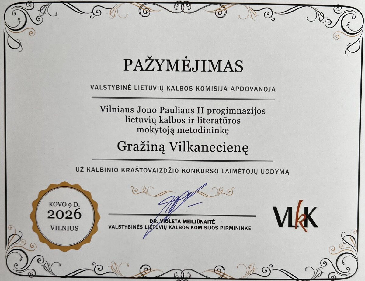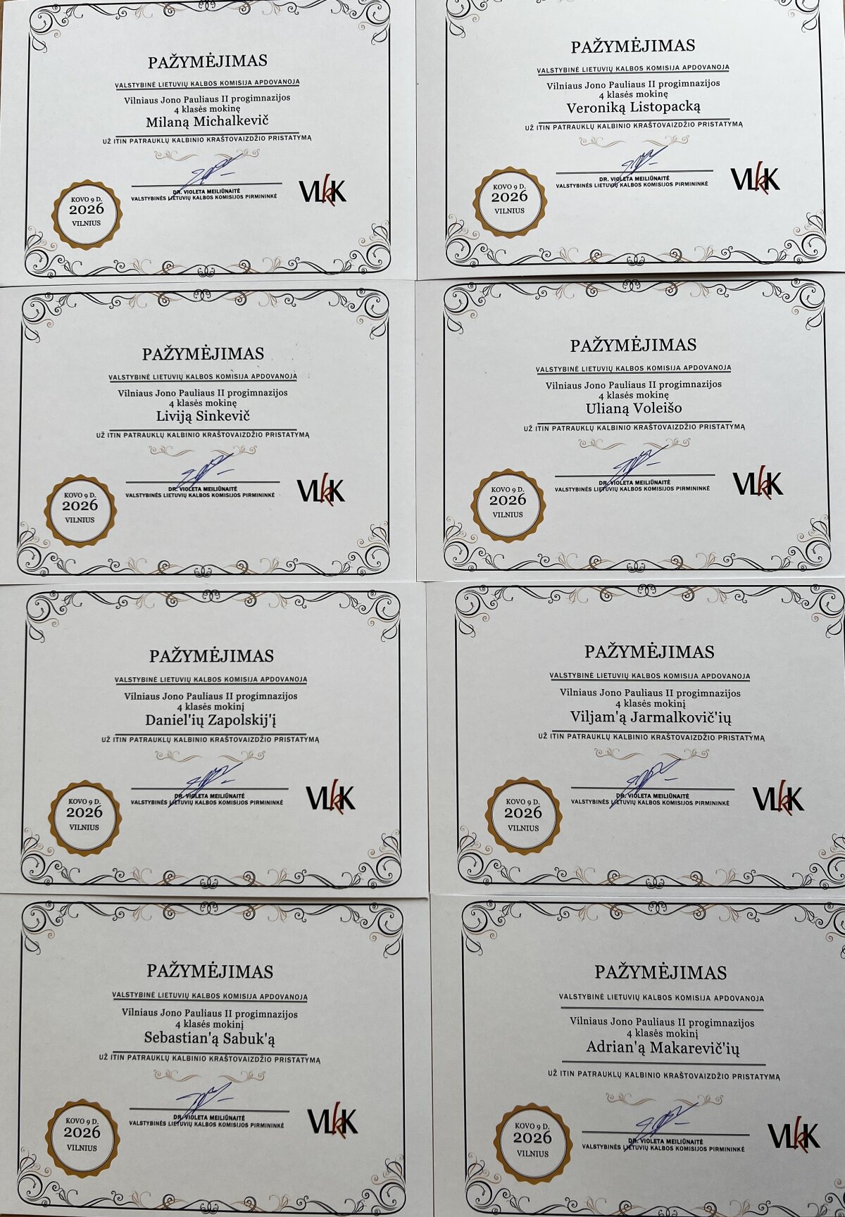 Valstybinė lietuvių kalbos komisija Vilniaus Jono Pauliaus II progimnazijos 4b klasės mokinių darbus paskelbė geriausiais 1–4 klasiųkategorijoje ,,už itin patrauklų kalbinio kraštovaizdžio pristatymą“.