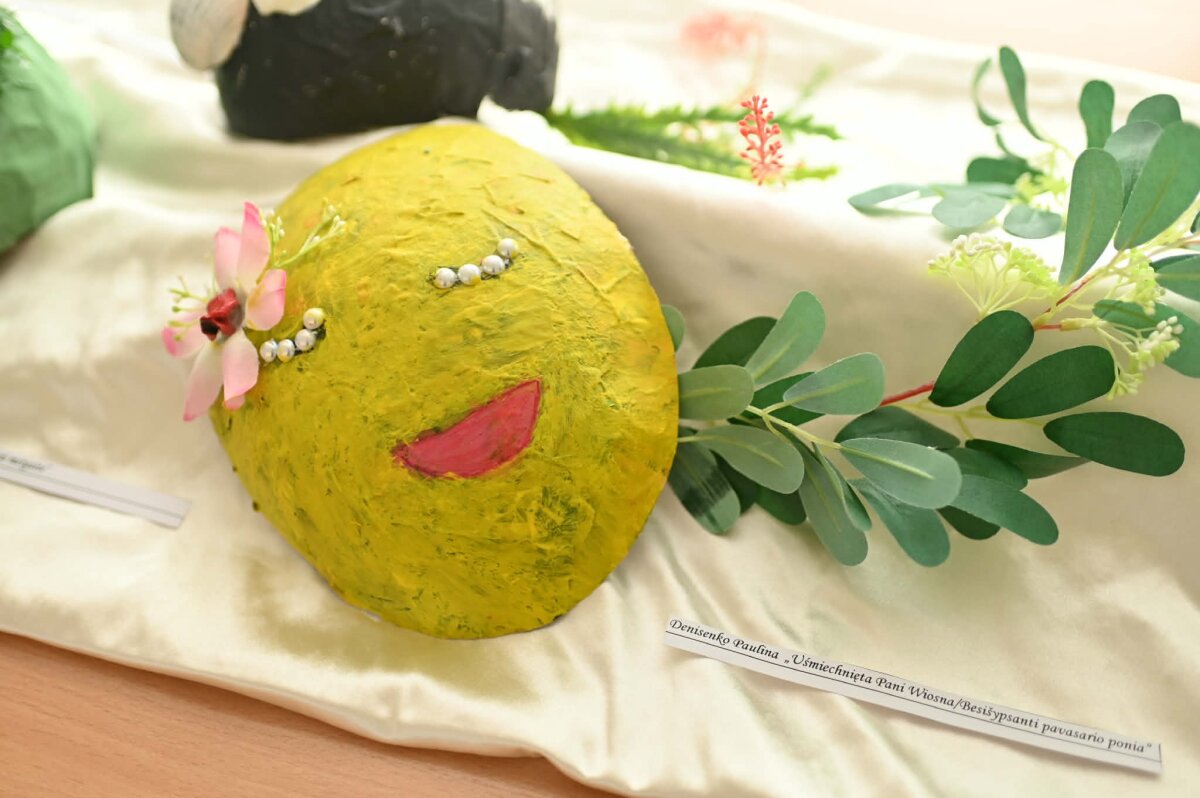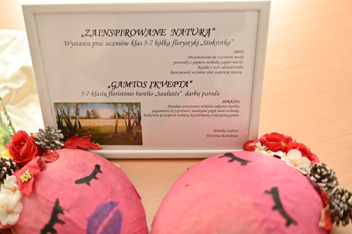 Mokytojų kambaryje eksponuojama išskirtinė būrelio „Stokrotka“ mokinių darbų paroda. Jaunieji kūrėjai pristatė kaukes, sukurtas papjė mašė technika, įkvėpti gamtos pasaulio. Papjė mašė technika – tai erdvinių formų kūrimas, sluoksniuojant klijais sudrėkintą popierių. Išdžiūvęs jis tampa lengvas, bet tvirtas.