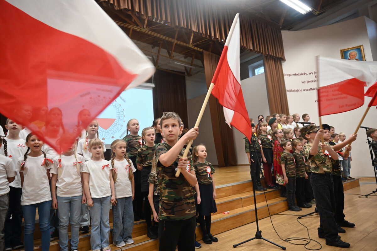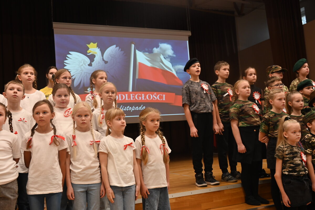 Ważnym punktem dnia był uroczysty koncert przygotowany przez uczniów klasy 3A z wychowawczynią panią Aliną Narkiewicz i utalentowanym zespołem „Olalajki” z solistkami z „Nastolatków” prowadzonych przez panią Alinę Judycką. Mali artyści z ogromnym zaangażowaniem przedstawili inscenizację o drodze Polski do wolności, pięknie – prosto z serca wyśpiewane zostały ważne słowa o przywiązaniu do Ojczyzny i odpowiedzialności za jej losy. Prowadzący uroczystość zaangażowali również widownię. Ze sceny padło wiele pytań o dzieje Polski i jej symbole narodowe. Na szczęście, na wszystkie pytania zebrani uczniowie odpowiadali gromko i entuzjastycznie. Bo to przecież obowiązek znać historię i tradycje Polski.